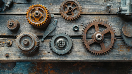 A collection of rusty metal gears and tools on a wooden bench, adding a rugged, industrial rustic touch