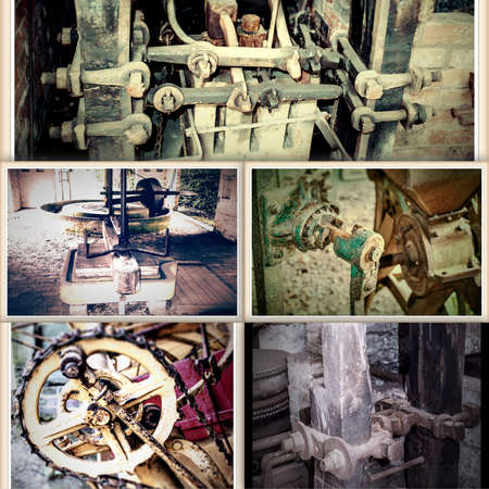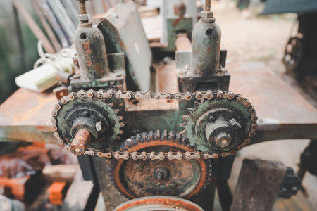 Grain Image: Close up of old machine factory made of steel and used in the past. Broken and rustic machine left over in abandon factory. Image of aged equipment with rust and gear part.