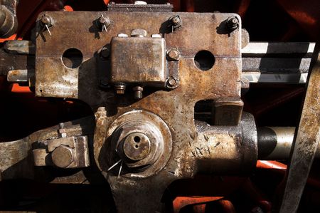 vintage retro tractor rusty details close up. gearbox, levers, viring and mechanical arms with rust and paint leftovers in sunny day