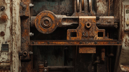 A close-up view of industrial machinery displaying rusty metal parts and gears in an abandoned factory. This image captures the essence of vintage manufacturing.