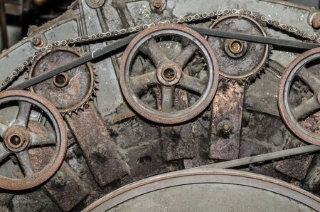 old factory engine and many wheels with chain
