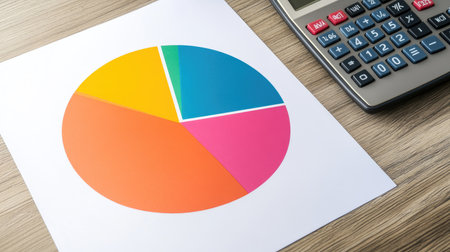 A detailed shot of a printed pie chart on a desk, with vibrant segments representing different data categories and a calculator beside it