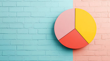 A colorful pie chart on a pastel background, showcasing three segments in pink, yellow, and red, against a blue and pink brick wall.