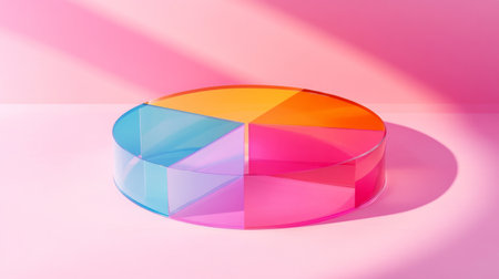 A vibrant pie chart displayed on a reflective surface, showcasing various segments in bold colors. Ideal for business, analysis, and marketing visuals.