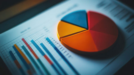 Colorful pie chart on a financial report with data visualizations displayed in a business setting in the afternoon