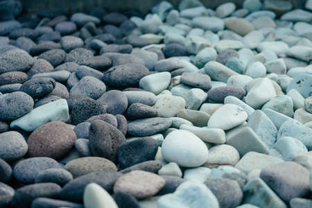 Different color beach stone pebbles at seashore outdoors top view. Nature background and textures. Summer vacation season.