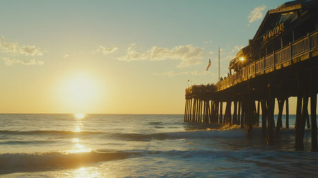 A breathtaking view of a sunset over the ocean, showcasing gentle waves and a rustic pier along the coastline, perfect for travel or nature-themed projects.