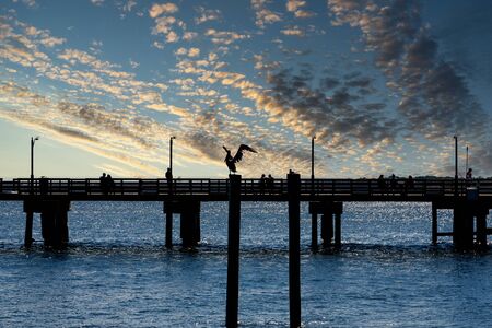 Naples Beach and Fishing Pier at Sunset, Florida. Dark silhouette of a pier over the water at sunset. Sunset over horizon and wooden pier of caribbean beach of Naples in Florida. Sunset over the Pier.