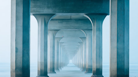 Perspective view beneath Scripps Pier highlighting the concrete pillars extending into the water, with misty waves and sky creating a serene, blurred horizon.