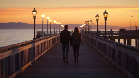 Romantic couple enjoying a leisurely stroll along a wooden pier, bathed in the warm glow of the setting sun