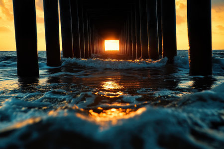 Waves gently crash against the supports of a pier as the sun sets, illuminating the horizon with warm colors and casting reflections on the water below.