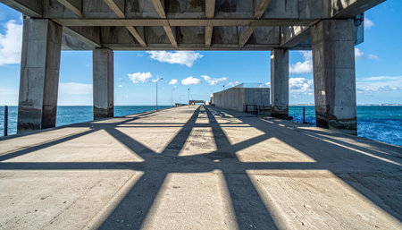 Picturesque Tranquility: A Serene Evening at Sea with Fishermen on a Long Pier