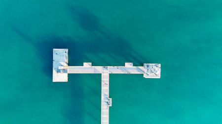 Captivating aerial view showcasing a wooden pier extending over tranquil waves, inviting you to explore the beauty of nature