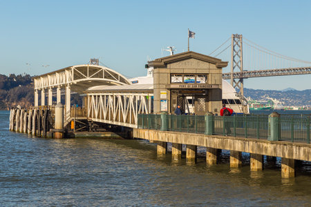 San Francisco, California, USA- 07 June: People at Gate B in the Port of San Francisco., Golden Gate Ferry Terminal. San Francisco Oakland Bay Bridge in the background.