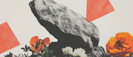 Minimalist collage exploring shapes and nature with floral elements and stone textures