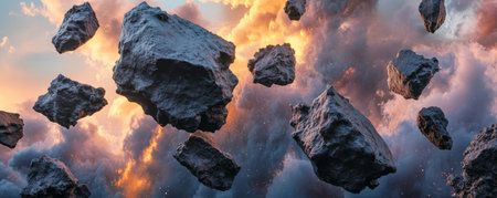 Floating meteorites against dramatic sky, cosmic scene. Astronomy and space exploration concept