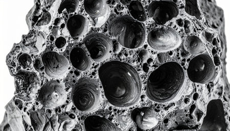 A detailed macro photograph captures the intricate and porous structure of a volcanic stone.