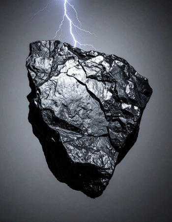 A brilliant bolt of lightning strikes a solitary lump of raw coal, illuminating its dark, jagged surface. This dramatic image captures the immense, raw potential and inherent power stored within fossil fuels, symbolizing the volatile moment of energy creation.