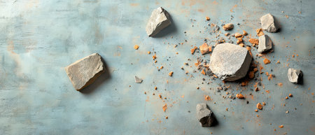 Various rocks are spread across a textured blue background showcasing different shapes and sizes with some fragments scattered around.
