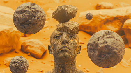 Group of rocks flying through the air with rocks falling off of them. Generative AI.