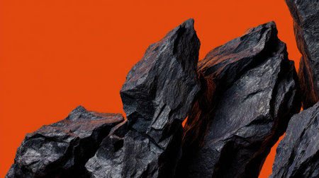 The image showcases dark charcoal rock formations set against a bold orange backdrop. The composition highlights textured, jagged forms under even lighting. This graphic arrangement could be suitable for various design applications, including marketing materials or artistic projects, offering visual interest and dynamic contrast.
