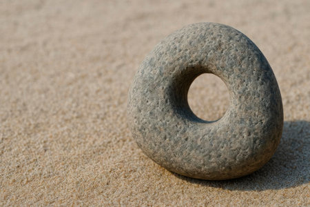 Rock on sandy surface with warm sunlight casting shadows in low angle close up view creating peaceful natural scene