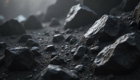 Broken black stones laid on smooth neutral-colored background, styled with depth and texture