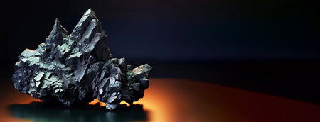 Acanthite is a rare precious natural geological stone eremite on a black background in low key. Fashionable jewelry elegant decoration. AI generated. Header banner mockup with space.