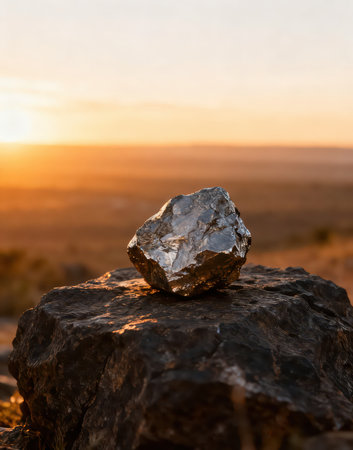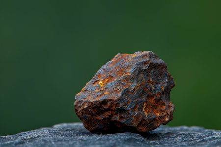 Exploring the intricate texture and metallic sheen of a meteorite on a rocky surface
