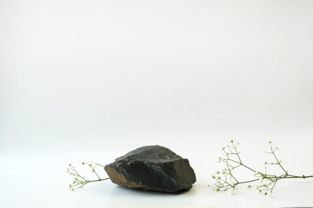 Mock up display shelf, gray stone pedestal scene and gypsophila flower on white background. Advertising and presentation for natural products