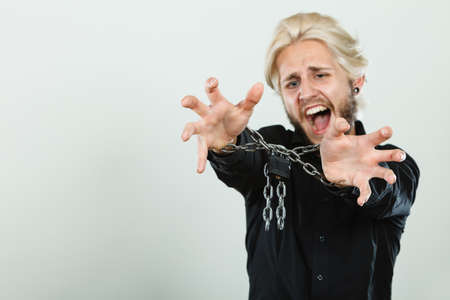 No freedom, social problems, human rights concept. Screaming furiously man with chained hands, studio shot on light grey background