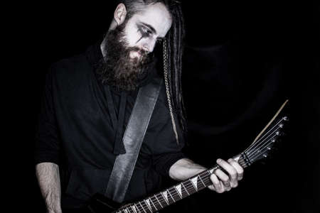 Brutal guitarist with black guitar over dark background