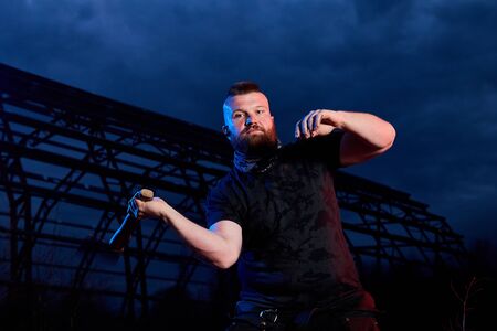 Brutal man who is a soldier, a military instructor, a saboteur or a spy trains with an axe on a military training ground at night. Bandit with big axe