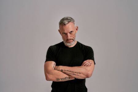 Strength. Middle aged man with crossed arms in black t shirt looking at camera while posing in studio over grey background
