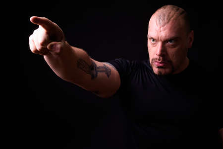 Portrait of muscular bald man against black background