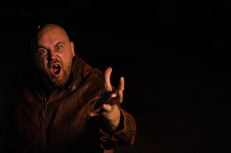 An angry man in a leather jacket attacks in the dark.