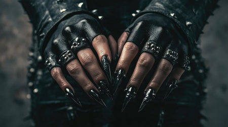 A close-up of hands with glossy black manicure and silver metal studs, against a dark textured background.