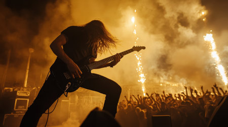 A high-energy rock concert with the guitarist shredding in the center of a pyrotechnic display