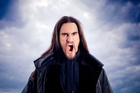 man with dreadlocks screams in a rage, looks like a viking, Iroquois haircut