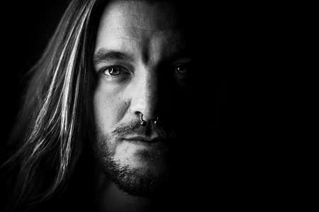 Man with long hair looks seriously and determined at the camera on an black and white image