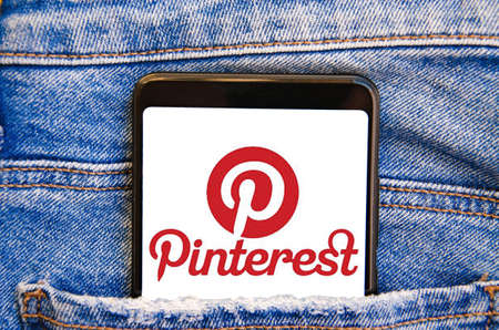 Pinterest. Smartphone in a pocket of blue jeans on a Pinterest smartphone screen on a blue, yellow, black background. Country July 2020. Kiev, Ukraine.