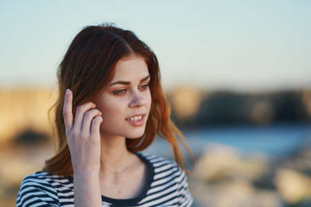 portrait of a woman in a striped t-shirt in the mountains near the rive