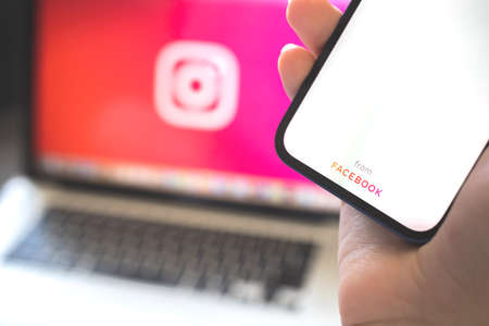 Kharkov, Ukraine - August 12, 2021: Instagram from facebook app. Woman using smartphone with instagram application. Brand