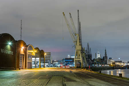 Antwerp, Belgium - February 5, 2020: Old harbor cranes on the banks of the river Scheldt