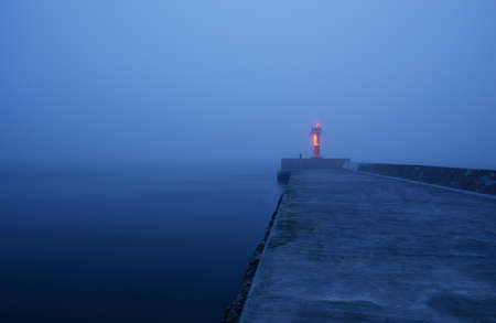 Panoramic view of Baltic sea. Port entrance, lighthouse, breakwaters. Thick fog, mist, blue light. Waves, water splashes, long exposure. Seascape. Monochrome scenery. Danger, safety concepts