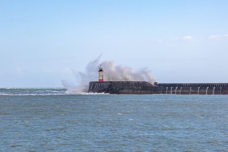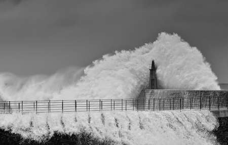 Giant waves batter the lighthouse & north pier guarding the mouth of the Tyne in Tynemouth, England