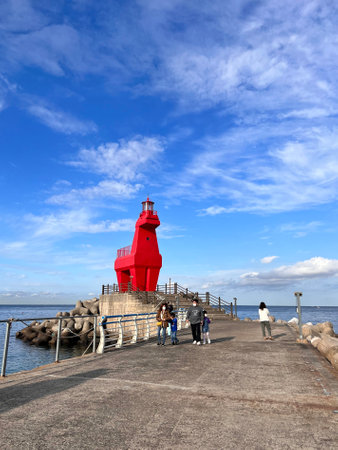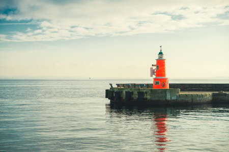 Port infrastructure: ship mooring, red lighthouse at sea and breakwater