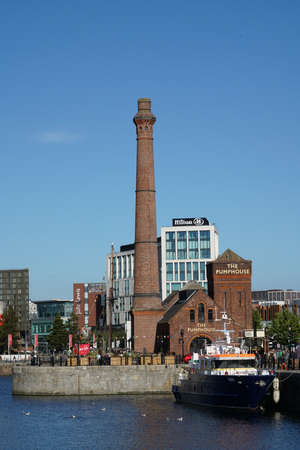 Albert Dock in Liverpool, UK - complex of buildings and warehouses opened in 1846, part UNESCO designated World Heritage Maritime Mercantile City. Red boat