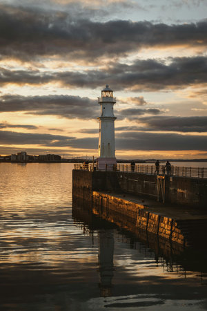 Lighthouse on the pier at sunset, Pontevedra, Galicia, Spain