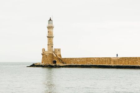 Venetian harbour and lighthouse in old harbour of Chania, Crete, Greece - sep, 2019.
